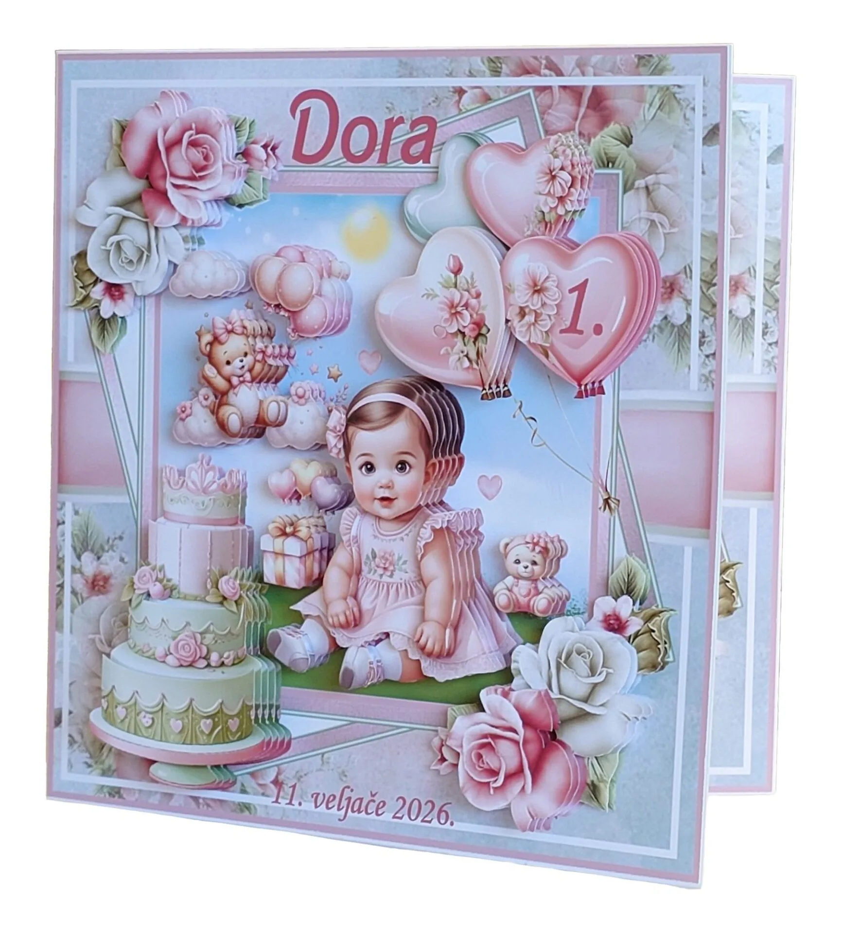 Čestitku je moguće personalizirati na prednjoj stranici (ime, broj, datum …) te ispisati posvetu na unutarnjoj stranici (nema ograničenja u broju slova).